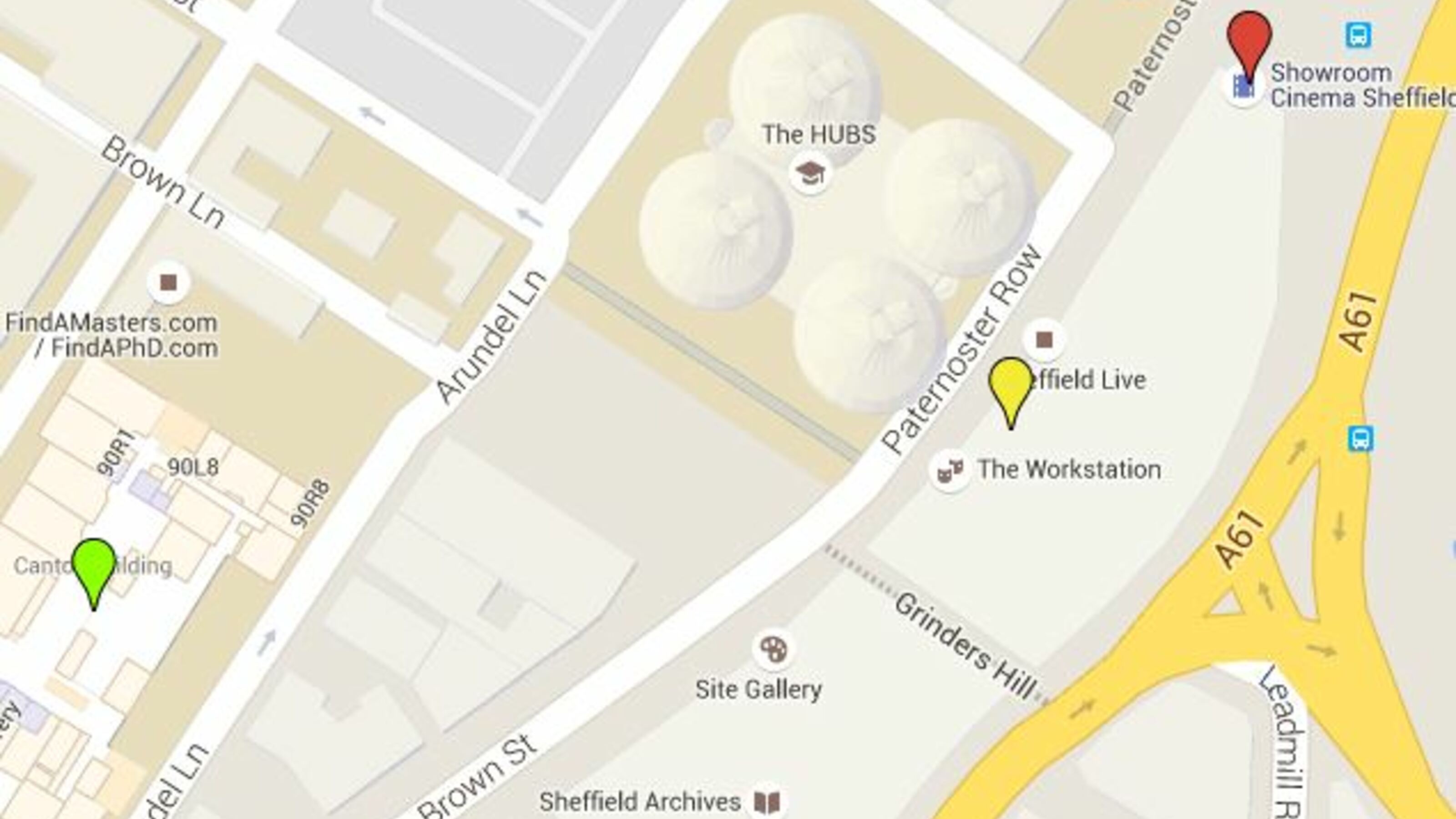 We have a screen in the Cantor Building at Sheffield Hallam University (marked in red above) which will be signposted well from the Showroom main entrance. It is a 2-3 minute walk between the two.