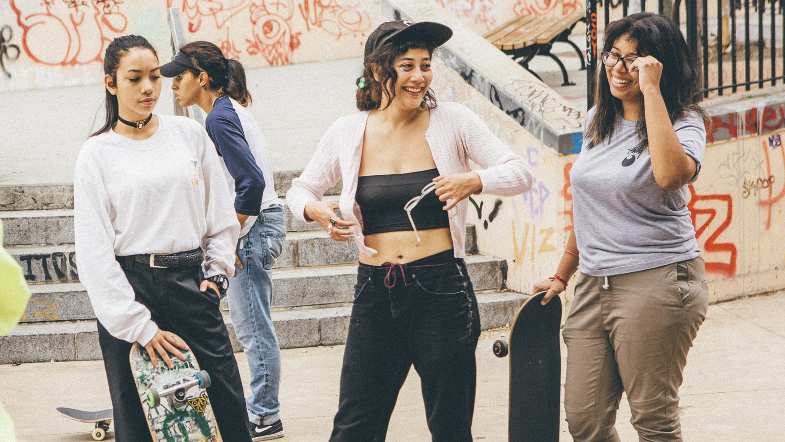 "Brujas" is an urban, free-form, creative and autonomous organisation that seeks to build radical political coalition through youth culture. This group of minority female skaters express community through skateboarding, art and political organising.Â