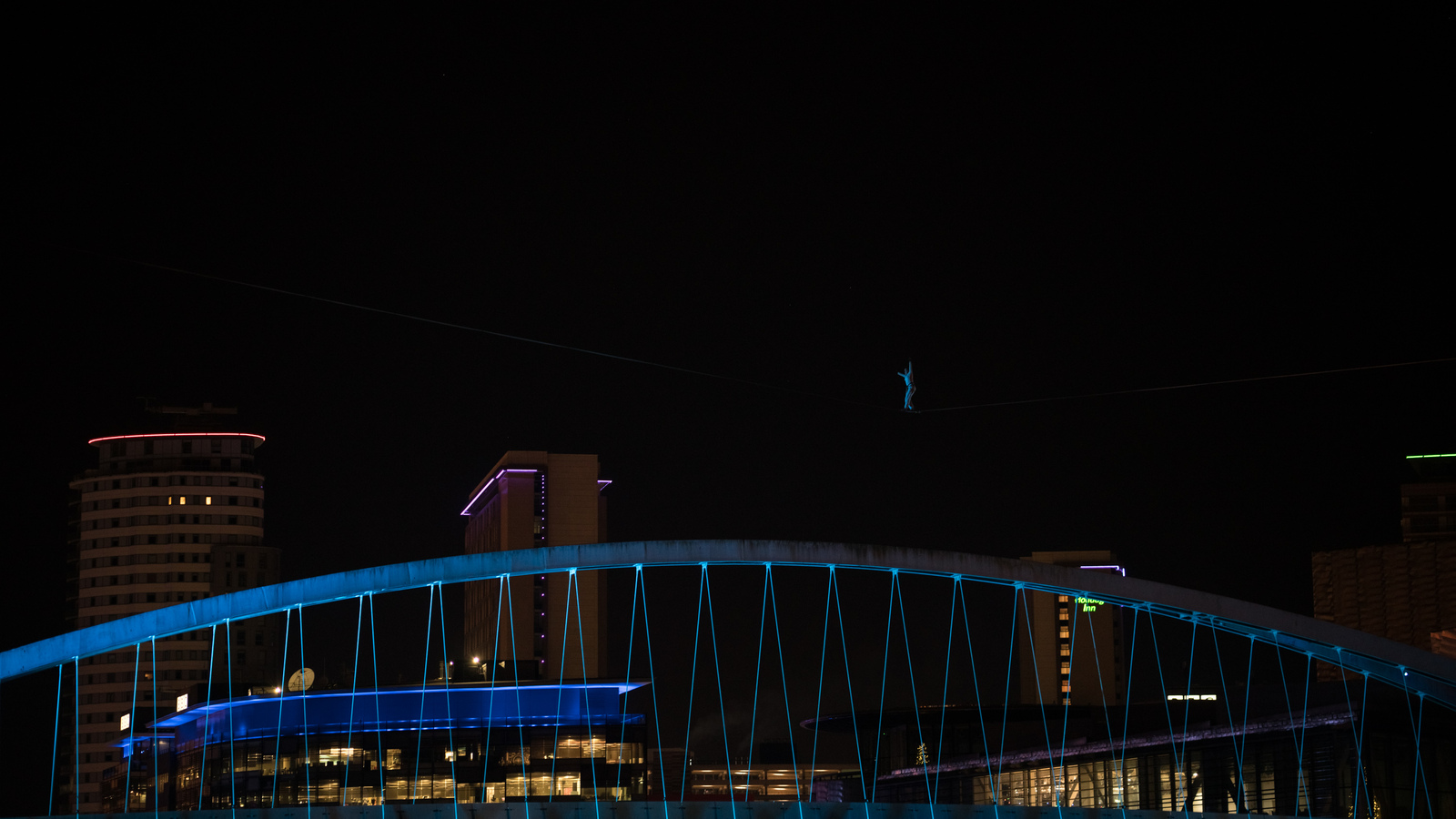 Athlete Sarah Rixham highlining over the Salford Quays Millennium footbridge (photo by Dora Dc)