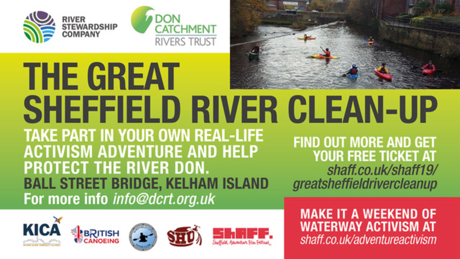 If you have been inspired by ShAFF's Paddle for the Planet screening on Friday 22nd March, why not join the Riverlution for real? The River Stewardship Company and Don Catchment Rivers Trust are hosting the Great Sheffield River Clean-up to take vital action to improve the health of the River Don and protect Sheffield against future flooding - and they need Sheffield’s active and adventurous community to help out!