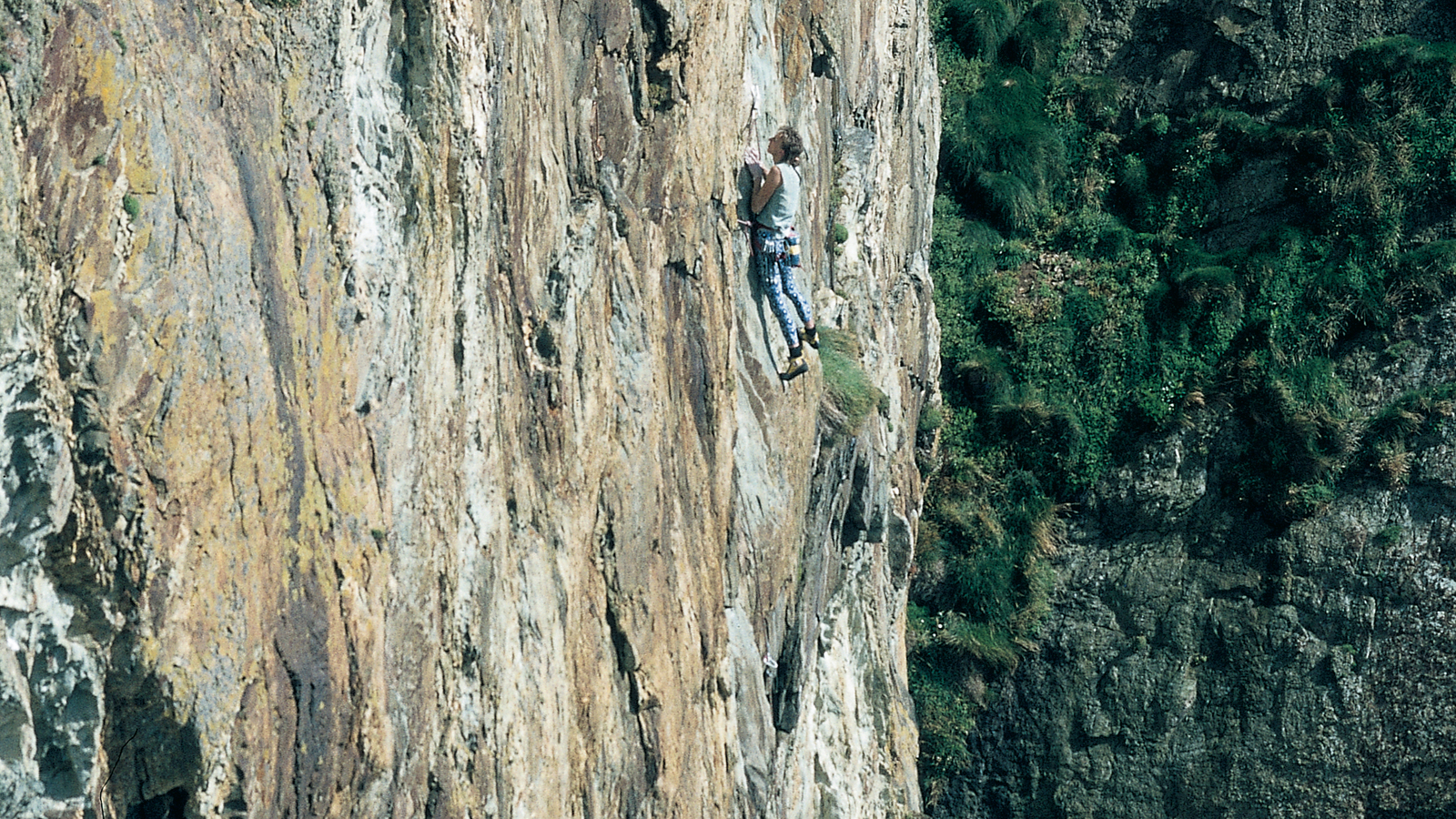 The wall drew me further in, to the central sweep right of the Heart of Gold. Rappeling down and discovering continuous lines of pockets and seams, it was like unwrapping a surprise parcel. And once I’d torn it open it was just the gift I’d been waiting for. In 280 feet I managed to find one peg placement, a poor downward-pointing knife-blade, which would have to serve as a belay. With Moose (Mike Thomas) I descended to the foot of the route. I set off on a tramline of sandy pockets in the grey wave. The first protection came after fifty feet of overhanging pocket-picking, taking care not to snap off the brittle edges. It was a briefcase-sized block detached on five sides and attached on its smallest end. Once looped it had to be laybacked and manteled. The bloated bodies of the Monster Alien Spiders wait for prey at the roof. I pull by and gain a foot-cramping rest on a hanging porcelain slab a little higher. I arrange a clutch of shallow protection in the blind seams in front of my face and begin what looks like three bodylengths of wicked dink-pulling. I gained height in convulsions. Classical music I’d heard in some car advertisement droned through my brain. I stopped being scared and, after an age of schizophrenic debate, I convinced myself that I could not fall off. I then began to look at myself rather than the rock. It was as though my body climbed while I gazed on … Peg. Stop. A threadbare stance in the middle of this Broccoli Garden.