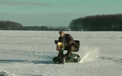 British plumber turned garage inventor and video maker Colin Furze takes his world record holding fastest mobility scooter out on the snow