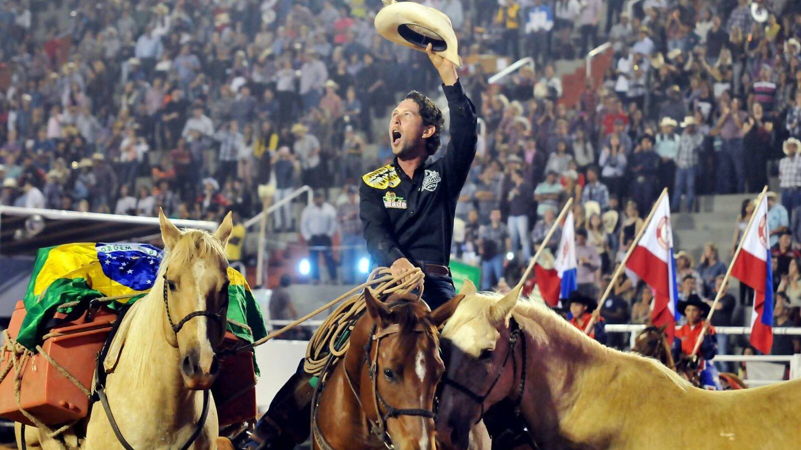 Filipe Leite at South America's largest rodeo with horses Frenchie, Bruiser and Dude